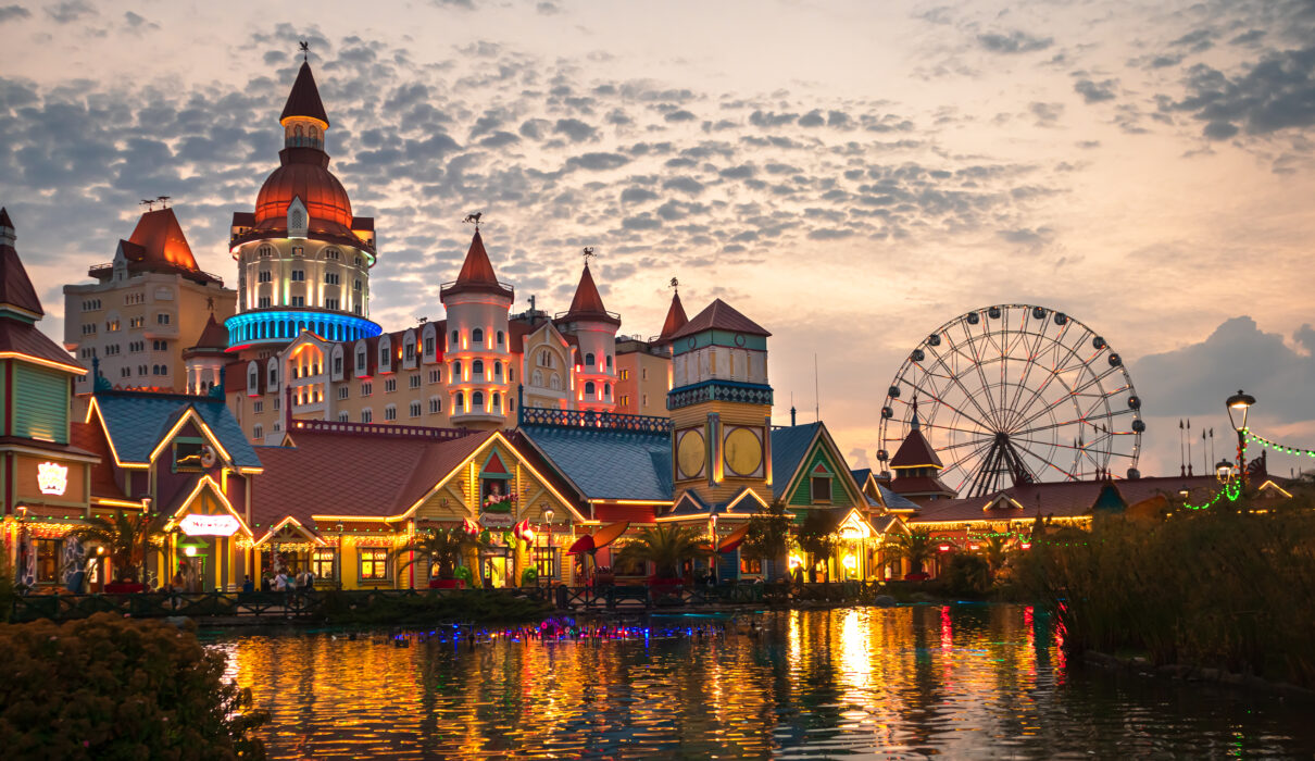 - The Skyline: Dominating the view is the 118-foot-tall North Mountain, topped by a shimmering recreation of Elsa’s Ice Palace.